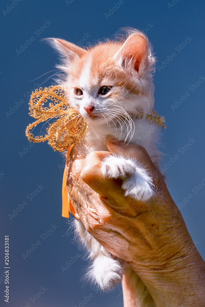 little ginger and white spots kitten sitting on the hands with ribbon bow on the neck as a present on a sky background