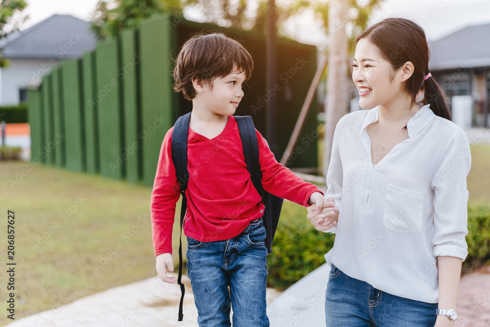 Mother get a son pupil from school after study school back to home with schoolbag family lifestyle.