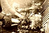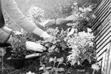 woman planting flowers in backyard garden flowerbed