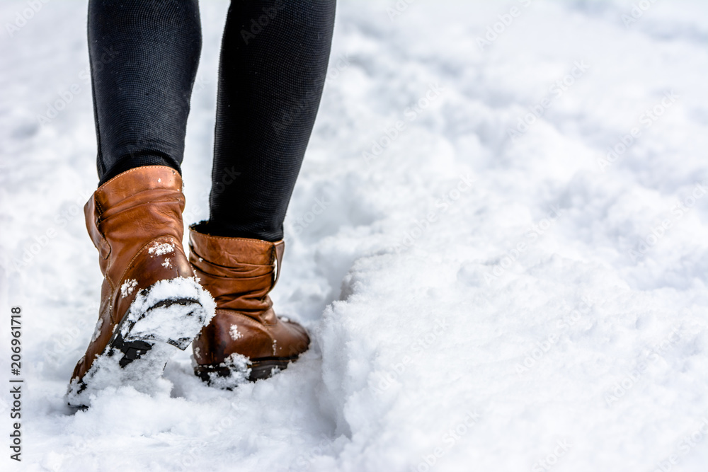 Brown boots in snow, woman put the step in snow, walking in winter