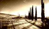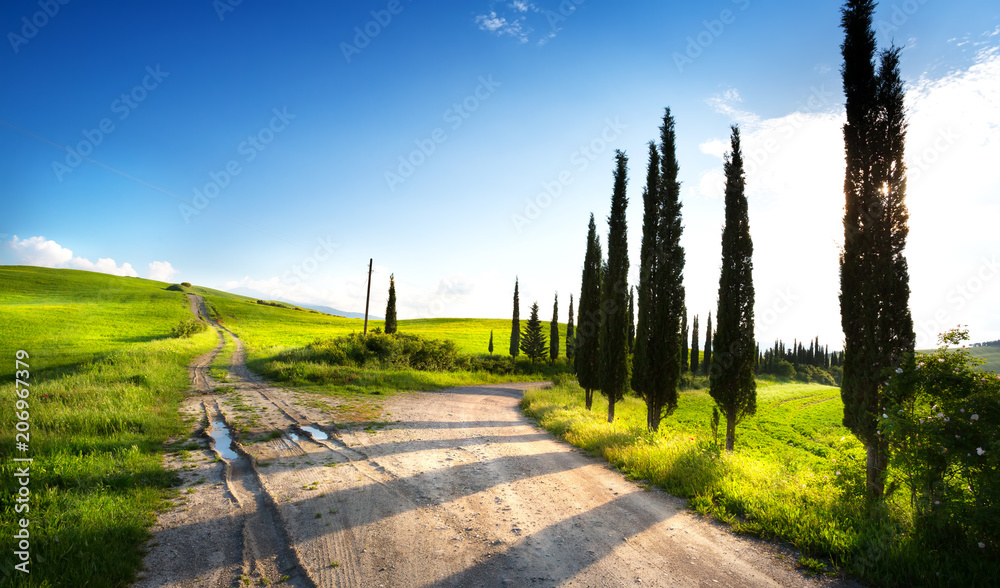 italy countryside landscape with cypress trees on the mountain path ; sunset over the tuscany hills