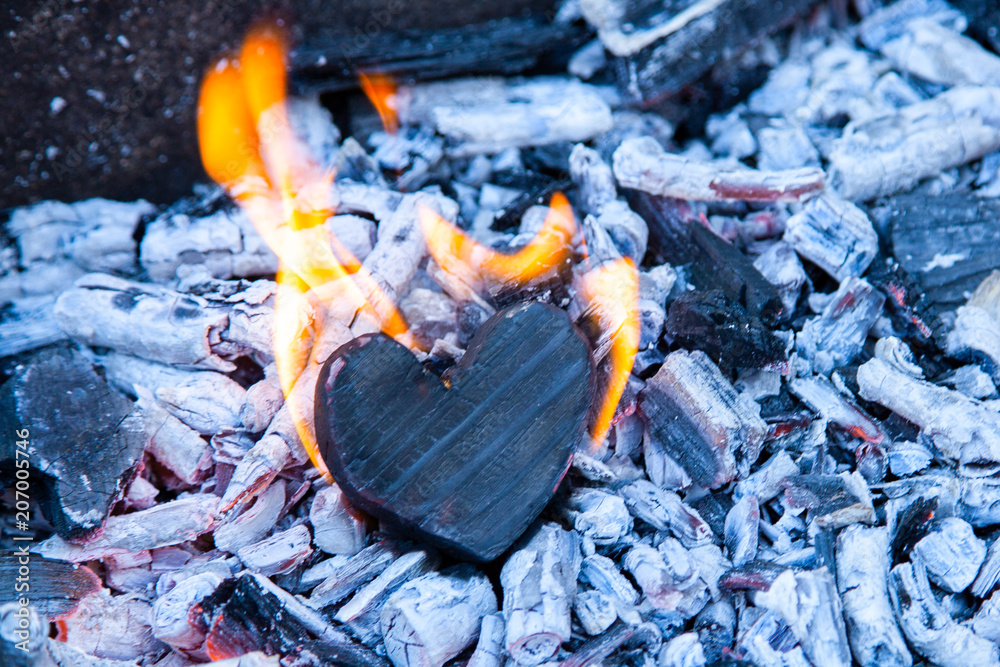 Heart burns in the fire. Wooden heart was charred and the flames on the coals. The concept of strong love, burning passion, broken relationships