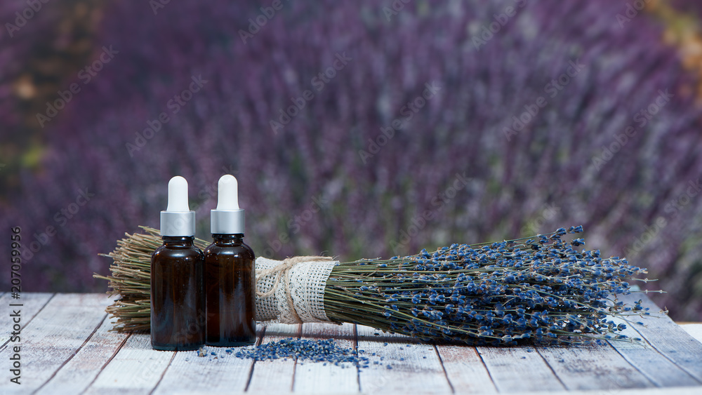 Oil, whey, cream with lavender. Organic cosmetics. A bouquet of lavender and jars on the background of a field of lavender. space for text