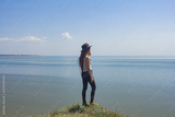minimalistic landscape with clay cliffs and sea and young woman hiker