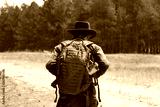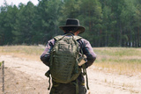 Back view of young male hiker in cowboy hat walking outdoors in summer day. Hipster traveler.