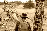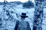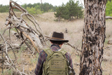Back view of young male hiker in cowboy hat walking outdoors in summer day. Hipster traveler.