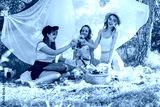 Group of girls friends making picnic outdoor. They sit, smile and drinking cocktail or juice. Cheers