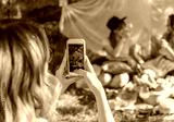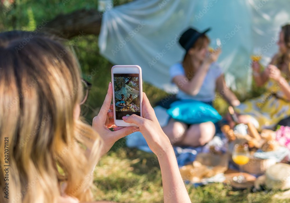 Group of girls friends making picnic outdoor. They make photo from smartphone