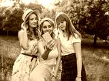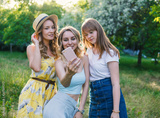 Group of girls friends making picnic outdoor. They take selfie photo from smartphone.