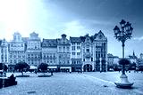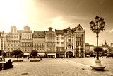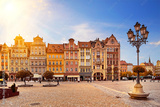 Central market square in Wroclaw Poland with old colourful houses, street lantern lamp and walking tourists people at gorgeous stunning morning sunrise sunshine. Travel vacation concept