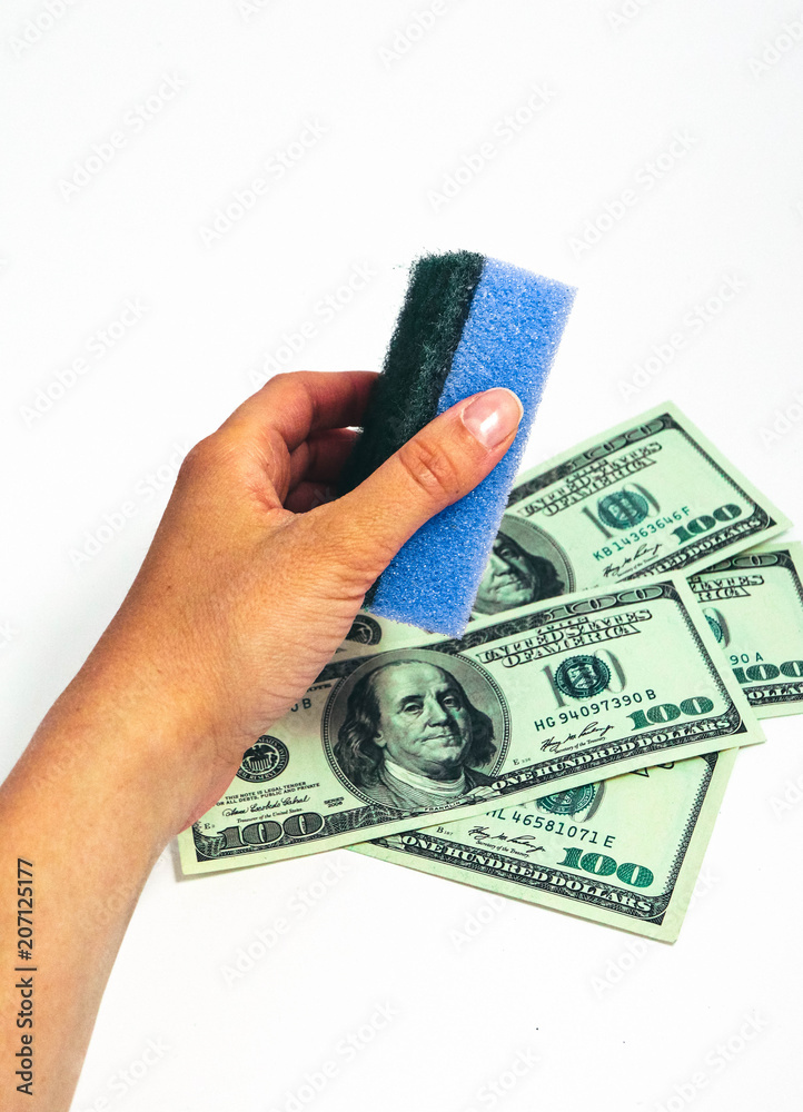 Money wash laundry, corruption concept. American dollars cleaning with washing sponge in a female hand.