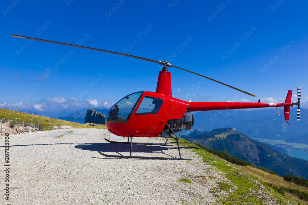 Bergpanorama vom Schafberg in Österreich mit geparkten Helikopter