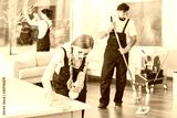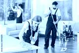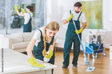 Cleaning service employees with professional equipment cleaning a private home after renovation
