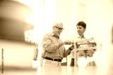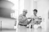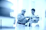 Showing the ropes. Upbeat senior engineer measuring a 3D model with caliper and showing how to do it to his young intern