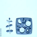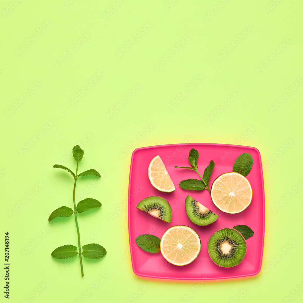 Vegan food Organic Concept. Lemon Kiwi Fresh Fruit with Green Mint leaves on plate. Creative Flat lay. Trendy Summer fashion Style. Minimal Design Art. Bright Color.