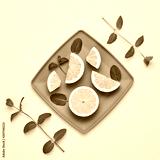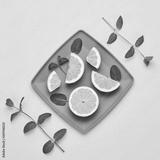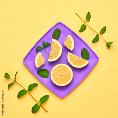 Vegan Citrus juice Organic. Yellow Lemon Fresh Fruit with Mint leaves on plate. Creative Flat lay. Trendy fashion Style. Minimal Design Art. Bright Summer Color.