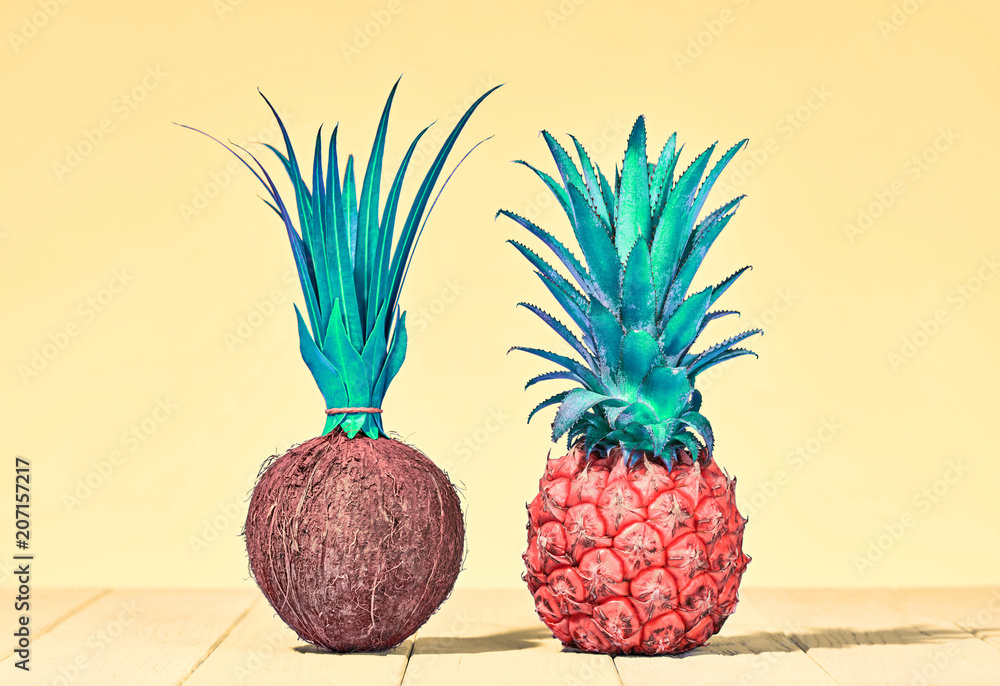 Tropical Pineapple and Coconut. Pastel Color. Creative Minimal. Hot Summer Vibes. Sunny Yellow background. Trendy fashion Style. Pop Art