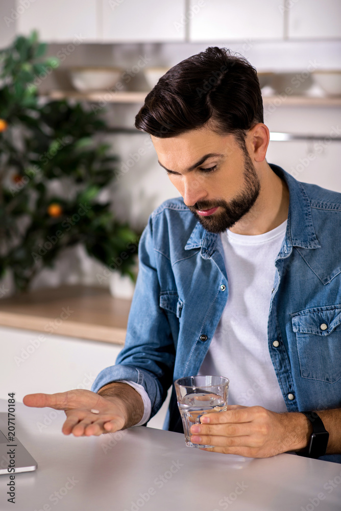 Young bearded man taking pills