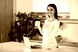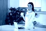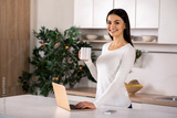 Nice smiling woman using laptop in the kitchen
