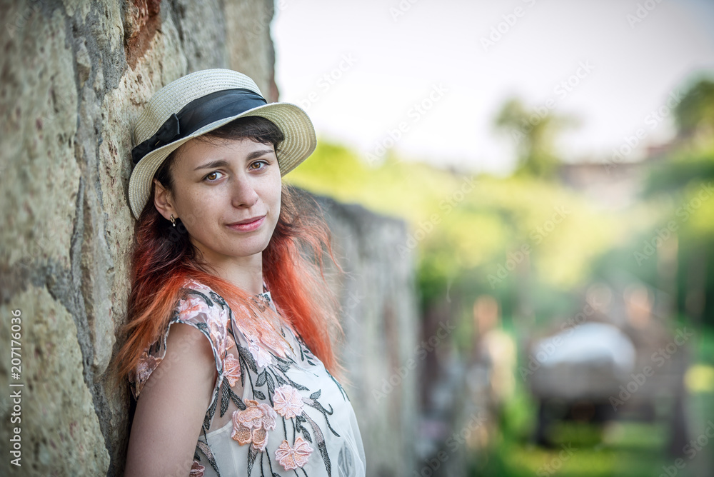 Girl with red hair in a hat leaning back against a stone retro wall