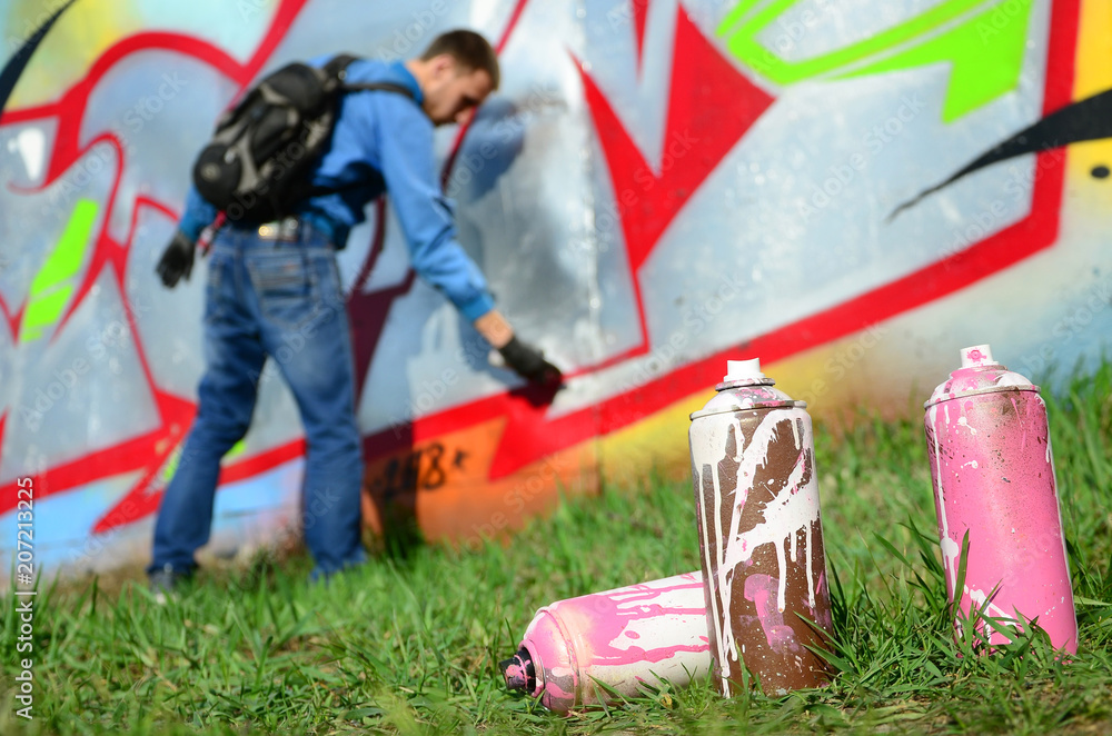 A few used paint cans against the background of the space with the wall on which the young guy draws a large graffiti drawing. Modern art of drawing walls in graffiti