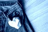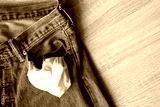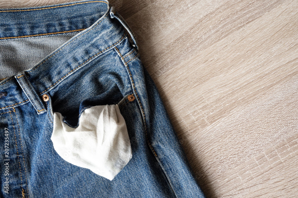 close up jeans front pocket, turning out the empty pockets with no money on wooden ground texture background with copy space,