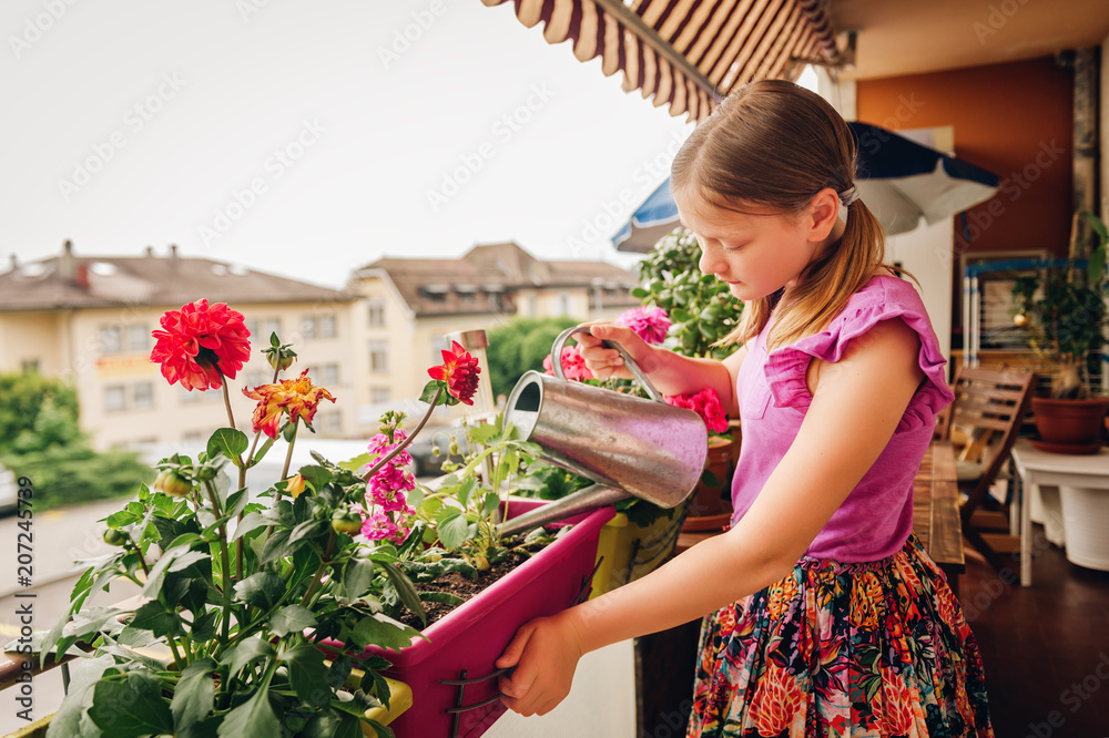 Adorable little girl watering plants on the balcony on a nice sunny day