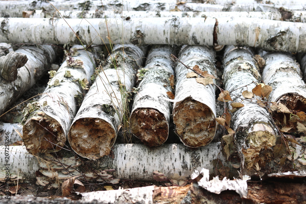 Birch logs in the autumn forest