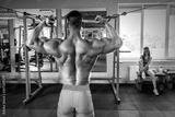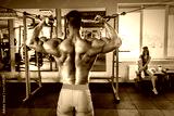 muscular bodybuilder man training his back in the gym