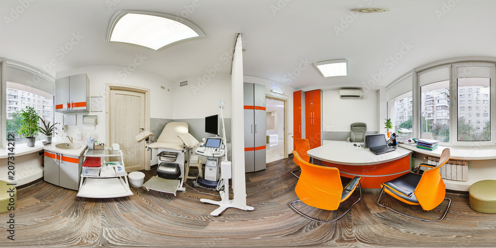 Panorama of an orangzhvedogo kamdineta doctor obstetrician gynecologist with a chair for examining women during pregnancy. Panorama of the doctor's doctor's office for the reception of pregnant women.