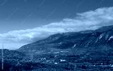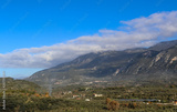 Panorama of mountain valley in Taygetos range on Peloponnese peninsula in Greece, with olive prunning fire and solar farm