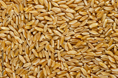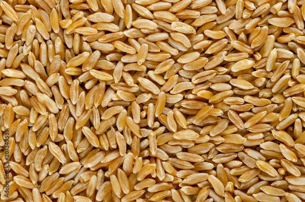 Kamut Khorasan wheat surface from above. Background. Grains of Oriental wheat, Triticum turanicum. An ancient recultivated grain from modern-day Iran region, with nutty flavor. Food photo, close up.