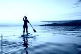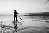 Adventurous girl on a paddle board is paddeling during a bright and vibrant sunset. Taken near Spanish Banks, Vancouver, British Columbia, Canada.