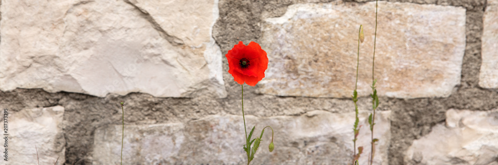Einzelner roter Klatschmohn vor Kalksteinmauer