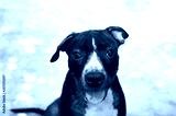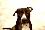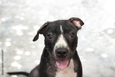 Black Pit bull puppy looking smile funny sitting on concrete background