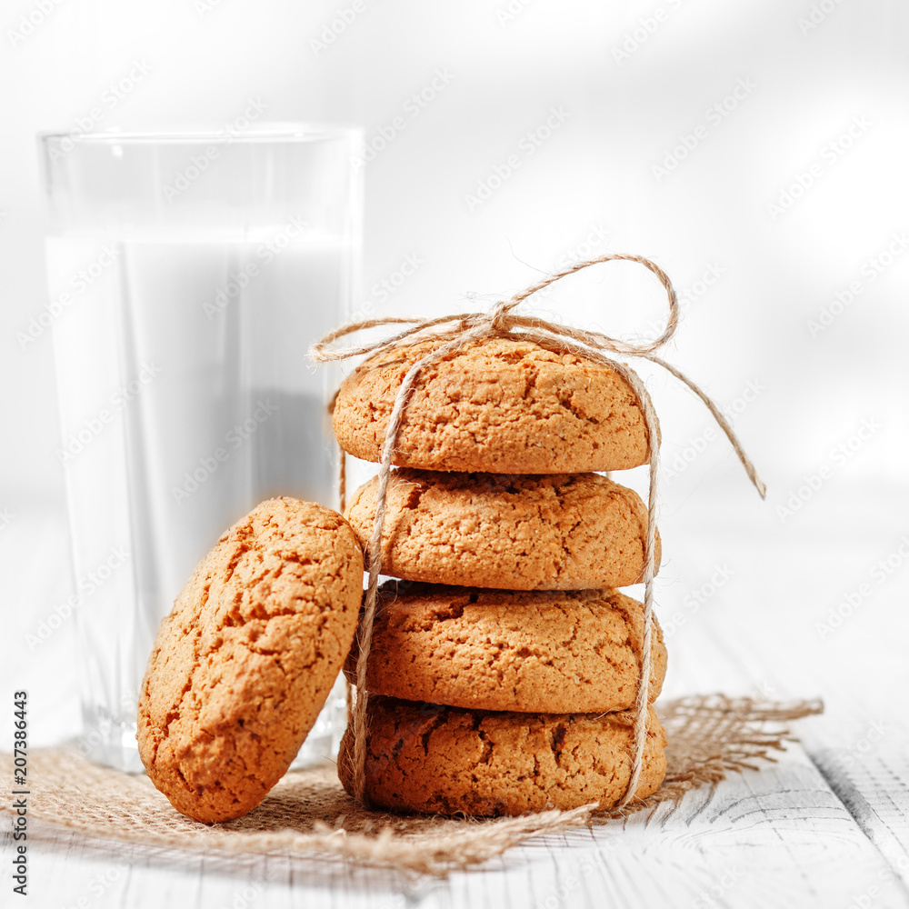 Oatmeal cookies and fresh milk. Square. The concept is healthy food, breakfast, vegetarianism.