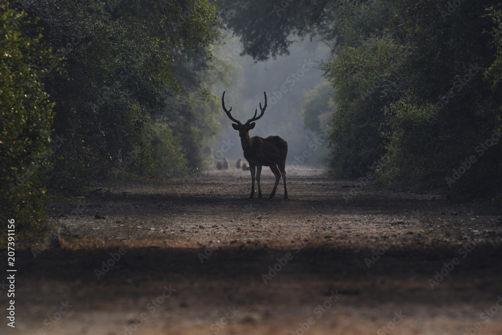 A spotted deer standing in the middle of the road inside bharatpur bird sanctuary on a winter morning