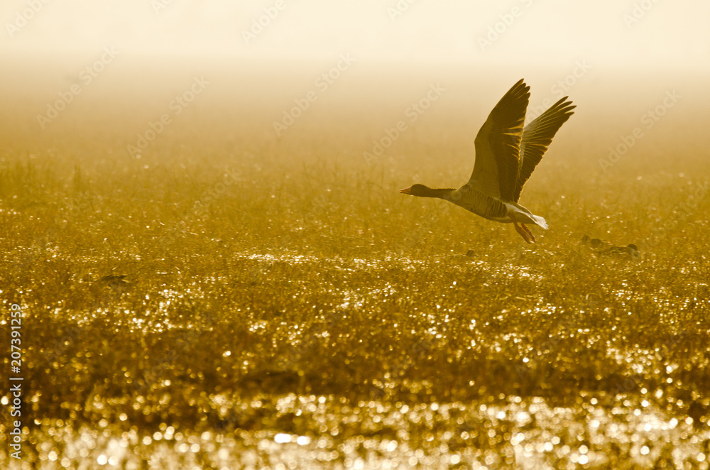 A greylag goose flying away with a misty background inside bharatpur bird sanctuary