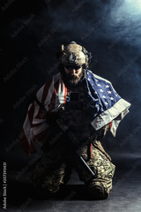 Soldier holding machine gun with national flag