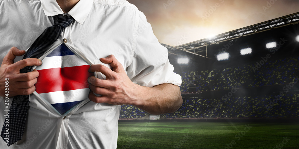 Costa Rica soccer or football supporter showing flag under his business shirt on stadium.