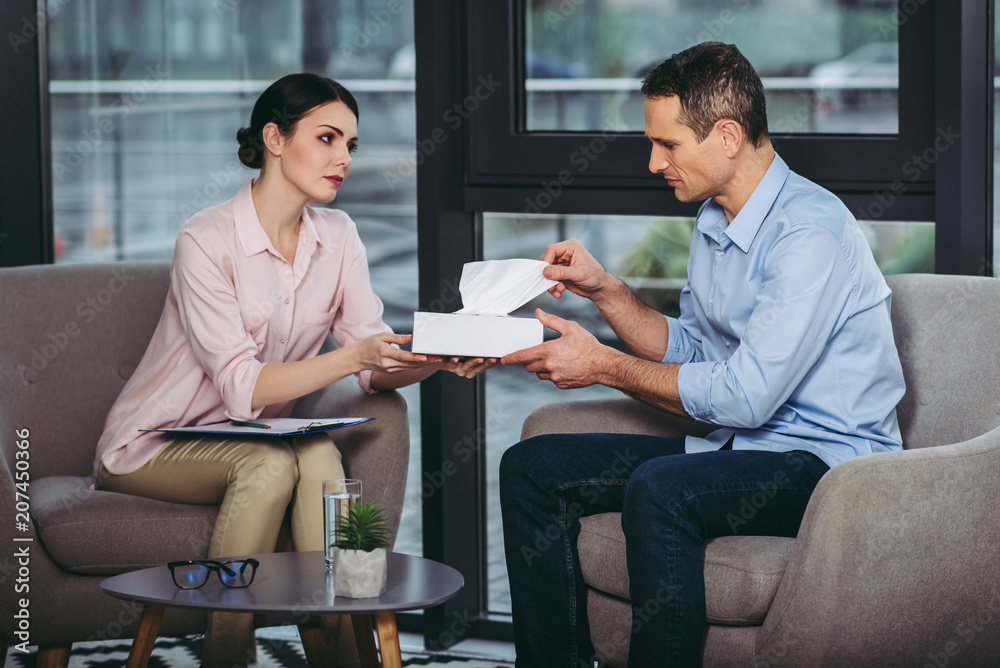 psychologist giving napkin to upset businessman
