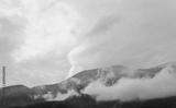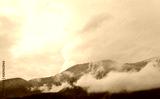 Photo depicting a backdrop foggy mystic pine tree woods in the mountains.