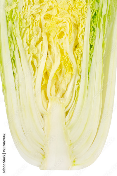 Napa cabbage half. Chinese cabbage. Cross section from above, isolated on white background. Also called nappa or wombok. Brassica rapa Perkinensis Group. Macro food photo close up.