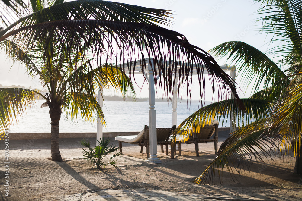 palmeras y tumbonas en una playa paradisíaca