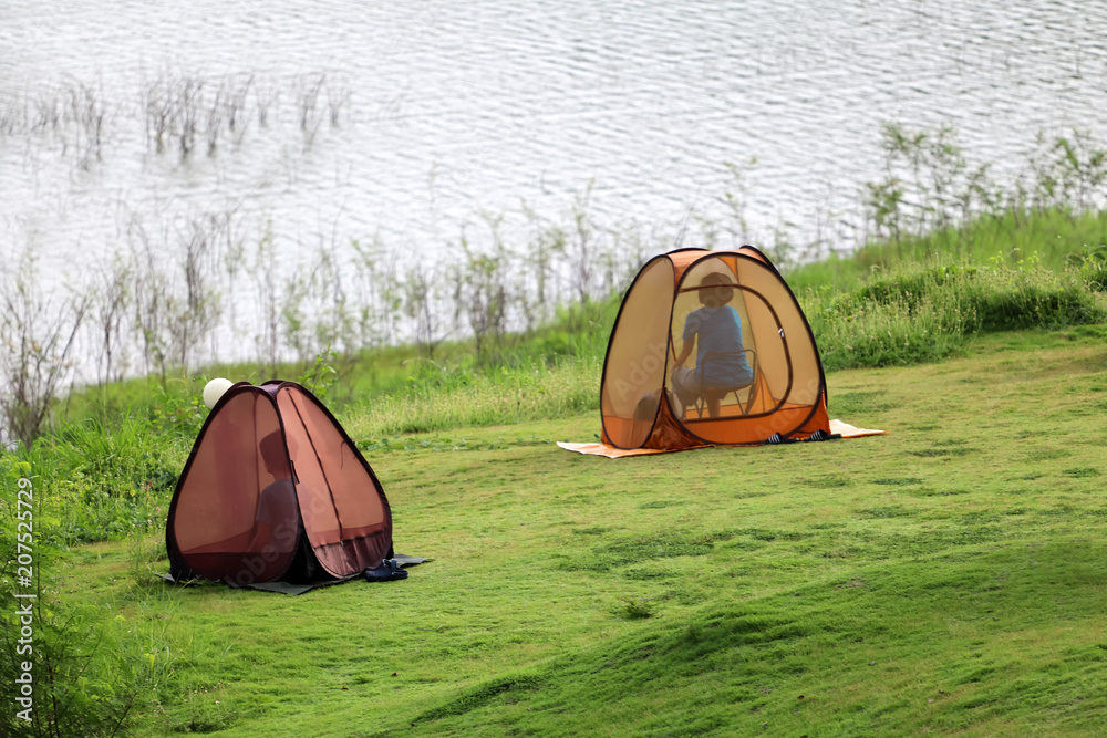 Asian Buddist people are prays meditations in the mesh dome or tents on the lawn with beautiful landscapes