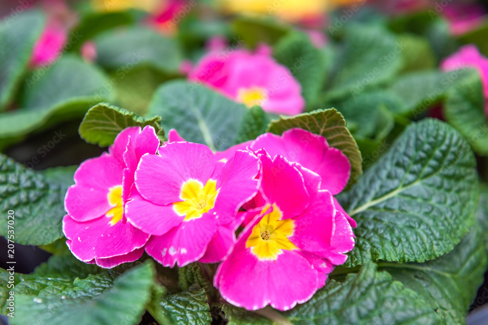 Pink and yellow Primula acaulis orion Rose Frost flowers macro closeup