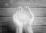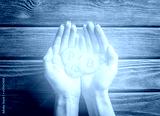 Many glowing gold bitcoins in female hands.