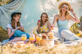 Group of girls friends making picnic outdoor. They sit, smile and playing cards