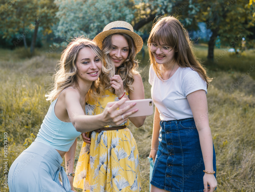 Group of girls friends making picnic outdoor. They make selfie photo from smartphone. bachelorette, party
