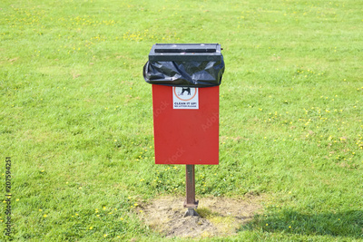 Dog poo waste bin bag environment sign on red bin in public park encouraging owners pick up afterwards uk
